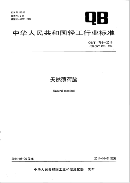 GB1886.199-2016食品安全國(guó)家標(biāo)準(zhǔn) 食品添加劑 天然薄荷腦